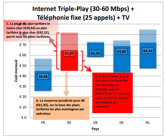 Concernant les offres triple play, la France devance largement ses camarades européens au niveau des tarifs, comme le montre le graphique ci-dessous.