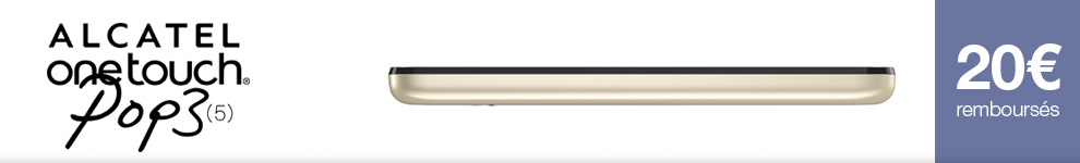 – Enfin, une nouvelle offre de remboursement concerne également l’Alcatel One Touch POP3 dont l’offre de remboursement permet un remboursement de 20€. Son prix d’achat peut ainsi tomber à 76€ en renvoyant le coupon de remboursement. Celui-ci est disponible ici.