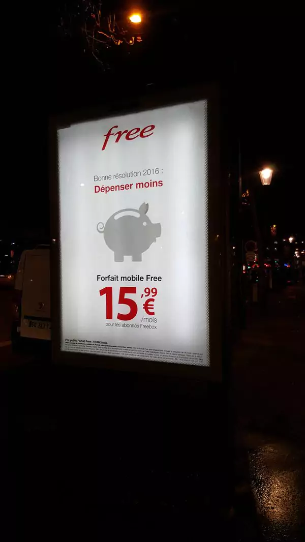 Nous vous informions mercredi du lancement d’une nouvelle campagne d’affichage Free mobile sur le thème des bonnes résolutions 2016. En plus des affiches « Etre généreux » et « Voyager l’esprit libre », il en existe une troisième : « dépensez moins ». Cette dernière affiche met en avant le forfait illimité à 15,99€ pour les abonnés Freebox.