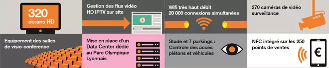 Orange déploie les solutions technologiques du Parc Olympique Lyonnais, qui devient le 1er stade 100% connecté de France. Grâce aux services déployés par Orange Business Services et à l’application mobile développée par l’Olympique Lyonnais, chaque supporter pourra découvrir une expérience numérique avant, pendant et après chaque match.