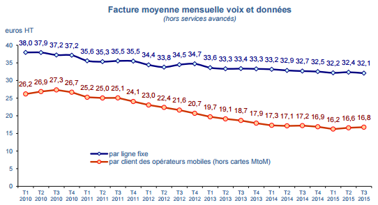L’ARCEP note que les modes de consommation évoluent au profit des services de données sur réseaux mobiles : depuis cinq trimestres, le trafic double pratiquement par rapport à l’année précédente (environ 150 000 téraoctets au troisième trimestre 2015). La consommation moyenne de données progresse rapidement : 723 mégaoctets par mois en moyenne par carte et jusqu’à 1,2 gigaoctet pour les clients se connectant à l’internet mobile. Le nombre de messages interpersonnels envoyés, 50,7 milliards dont un milliard de MMS, continue également d’augmenter (+4,9% en un an).