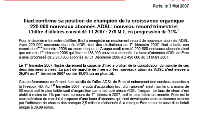 Pour le deuxième trimestre d’affilée, Iliad a enregistré un recutement record de nouveaux abonnés ADSL. Avec 220 000 nouveaux abonnés ADSL (net des résiliations) au 1er trimestre 2007, Iliad a battu son record du 4ème trimestre 2006 au cours duquel le Groupe avait recruté 202 000 nouveaux abonnés ainsi que celui du 1er trimestre 2006 qui était de 188 000 nouveaux abonnés. La base d’abonnés ADSL de Free a ainsi progressé de 2 278 000 abonnés au 31 Décembre 2006 à 2 498 000 au 31 Mars 2007.