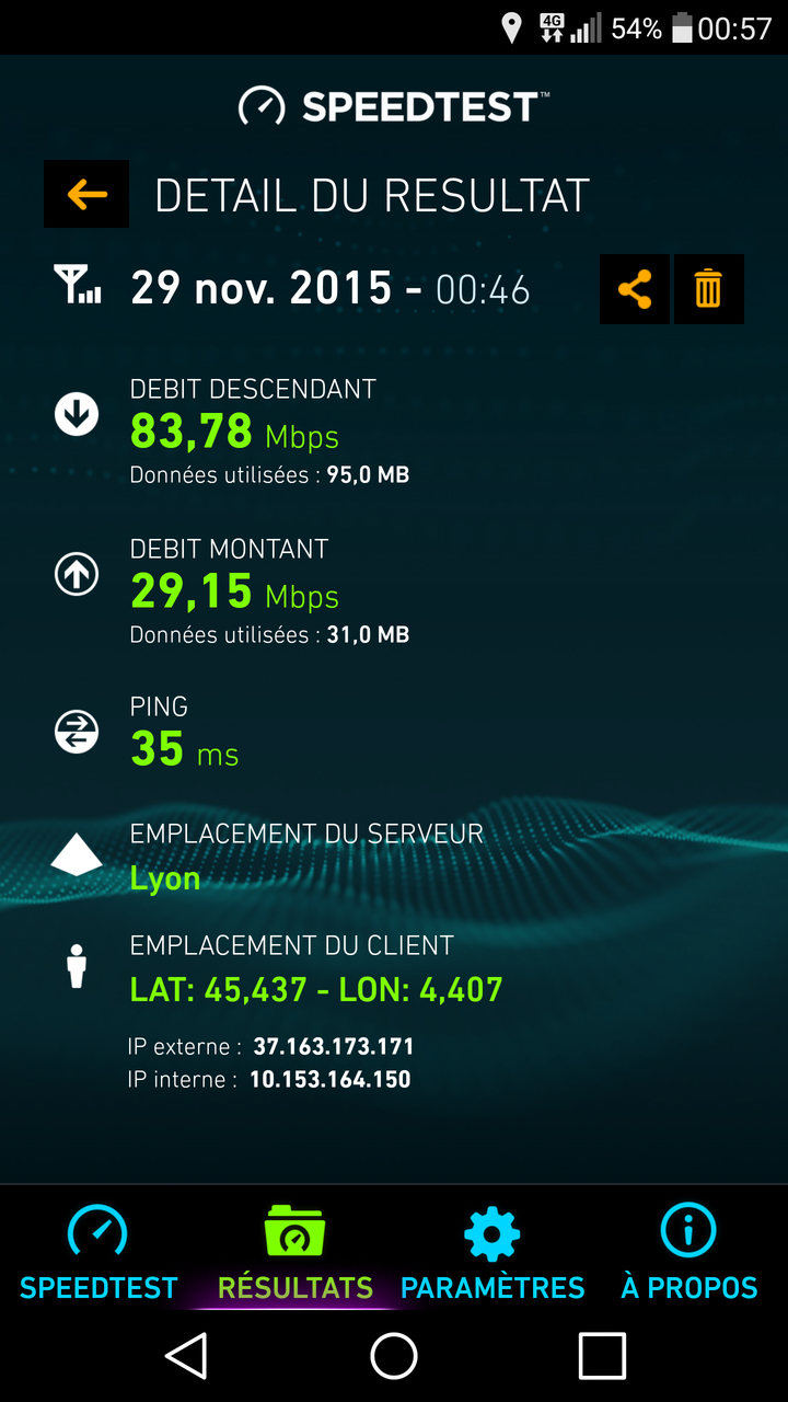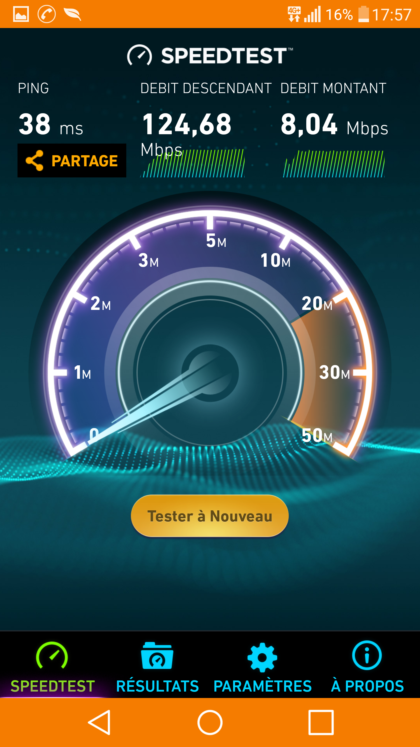 Grâce à ce déploiement, les abonnés en possession d’un mobile compatible peuvent surfer et réaliser des tests en 4G+ lorsqu’ils sont dans une zone de couverture. Ils peuvent ainsi profiter de débits plus élevés avec leur Forfait Free 50 Go. C’est le cas de Sophie, une abonnée Free Mobile de St-Etienne, qui nous a envoyé plusieurs captures montrant le gain de débit immédiat lorsque la 4G+ est disponible. En 4G, elle dispose de 83.7 Mb/s alors qu’en 4G+, le débit grimpe à 124.6 Mb/s :
