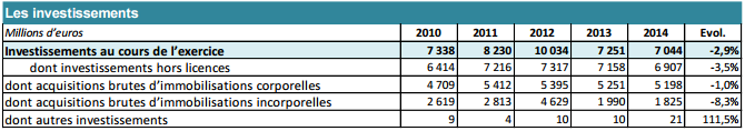 Le montant des investissements réalisés par les opérateurs au cours de l’année 2014 s’élève à 7,0 milliards d’euros, en baisse de 2,9% par rapport à 2013. Hors achats de licences, le niveau des investissements des opérateurs diminue également de 3,5%, mais se maintient depuis quatre ans sur un niveau d’environ 7 milliards d’euros (6,9 milliards d’euros en 2014).