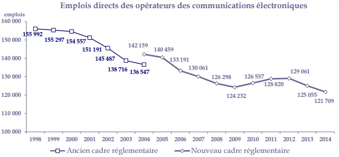 Après environ dix ans de baisse continue, et une amélioration notable entre 2010 et 2012, le niveau d’emploi repart à la baisse depuis 2013. A la fin de l’année 2014, les opérateurs emploient directement 121 700 personnes, soit 3 300 personnes de moins (-2,7%) en un an. La totalité de la baisse est portée par le recul des effectifs non cadres (-5,4%), le nombre de cadres étant pratiquement stable par rapport à 2013 (+0,2%).
