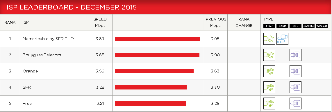 Comme chaque mois, Netflix publie son ISP Speed Index, qui mesure la vitesse moyenne de ses flux selon les pays et les opérateurs. Pour le dernier mois de l’année 2015, pas de jaloux, tous les opérateurs affichent une baisse du débit mesuré, mais dans des proportions peu importantes, de l’ordre de 0,05 Mbps. Les positions des opérateurs ne bougent pas : Numéricâble reste en première position avec un débit moyen de 3,95 Mbps, et Free en dernière position avec 3,28 Mbps