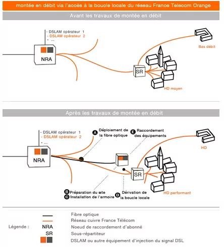 Une telle opération de montée en débit implique un réaménagement de la boucle locale d’Orange et suppose de déployer de la fibre optique entre le nœud de raccordement abonné d’origine (NRA-O) et le sous-répartiteur (SR), jusqu’ici relié en cuivre. Il s’agit aussi d’organiser la migration des équipements depuis l’ancien NRA (le NRA-O) vers le nouveau NRA de montée en débit (NRAMED) construit à proximité du sous-répartiteur.