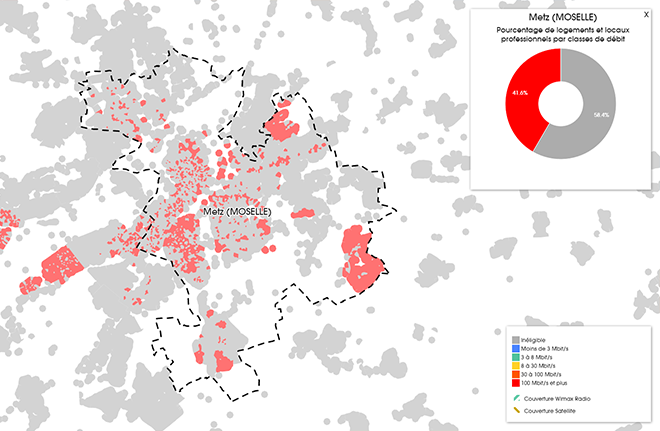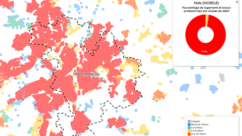 La ville de Metz est majoritairement couverte par le très haut débit, avec 97,4% des logements et locaux professionnels dépassant les 100 Mbit/s. Seul 2% de la ville reste encore sous la barre des 30 Mbit/s.