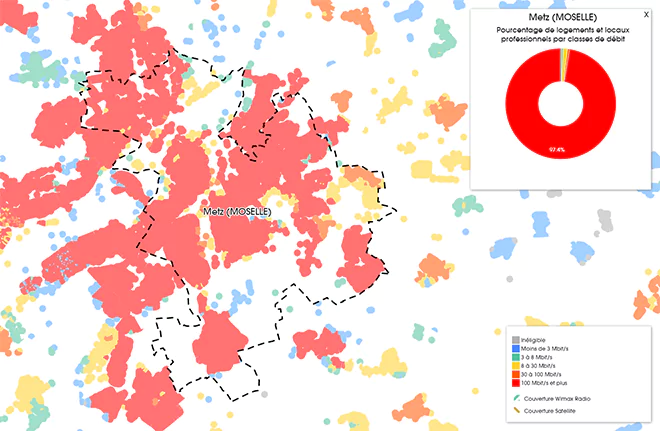 La ville de Metz est majoritairement couverte par le très haut débit, avec 97,4% des logements et locaux professionnels dépassant les 100 Mbit/s. Seul 2% de la ville reste encore sous la barre des 30 Mbit/s.