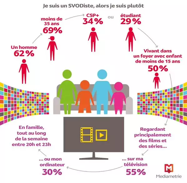 Médiamétrie a réalisé une étude sur les utilisateurs des services de VOD par abonnement, comme Netflix ou Canalplay. De ces résultats, l’institut de mesure d’audience a tiré un portait robot de ces consommateurs. Ceux-ci sont plutôt jeunes, masculins et utilisent ce service principalement le soir pour regarder des séries et des films.