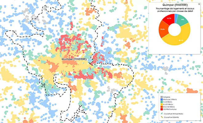 On se rend compte, grâce à la carte du déploiement FTTH, que les 14,7% de logements et locaux professionnels dépassant les 100 Mbit/s le sont grâce à la fibre. La technologie câble n’étant pas présente sur la ville de Quimper.