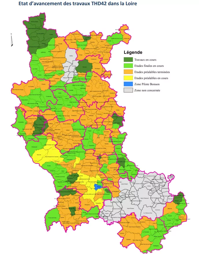 Le projet THD42 concerne toute la Loire hormis les périmètres de Saint‐Etienne métropole (43 communes) et des 6 communes qui composaient initialement le Grand Roanne. En effet, sur ces territoires, l’opérateur Orange s’est engagé à assurer le développement de la fibre optique pour toutes les communes. 277 communes de la Loire doivent ainsi pouvoir bénéficier du réseau créé par THD42.