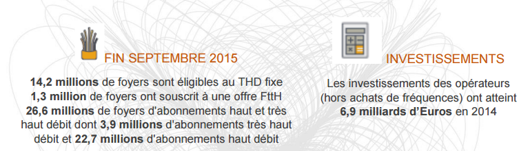 L’installation plus ferme de la concurrence, l’apparition de nouveaux acteurs indépendants de l’opérateur historique, l’enrichissement des offres et le développement des initiatives publique : tous ces facteurs ont joué un rôle dans le développement haut débit et très haut débit que l’on connaît aujourd’hui. Depuis la fin du mois de septembre 2015, l’ARCEP estime que 26,6 millions de foyers sont abonnés au haut débit ou au très haut débit.
