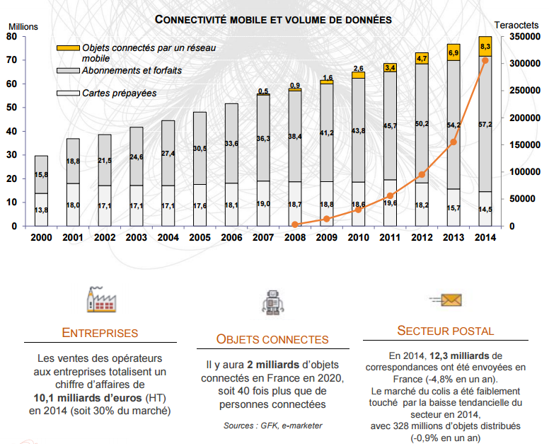 De même, l’autorité de régulation explique que, grâce à un nouveau cycle d’investissements et un nouvel écosystème numérique, les usages du web ont profondément changé à travers les années. Par exemple, le nombre d’objets connectés a fortement augmenté depuis l’invention du smartphone en 2008. L’ARCEP estime même, en basant ses chiffres sur des études GFK et de e-marketer, que le nombre d’objets connectés en France atteindra deux milliards d’ici à 2020.