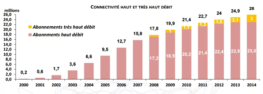 L’installation plus ferme de la concurrence, l’apparition de nouveaux acteurs indépendants de l’opérateur historique, l’enrichissement des offres et le développement des initiatives publique : tous ces facteurs ont joué un rôle dans le développement haut débit et très haut débit que l’on connaît aujourd’hui. Depuis la fin du mois de septembre 2015, l’ARCEP estime que 26,6 millions de foyers sont abonnés au haut débit ou au très haut débit.