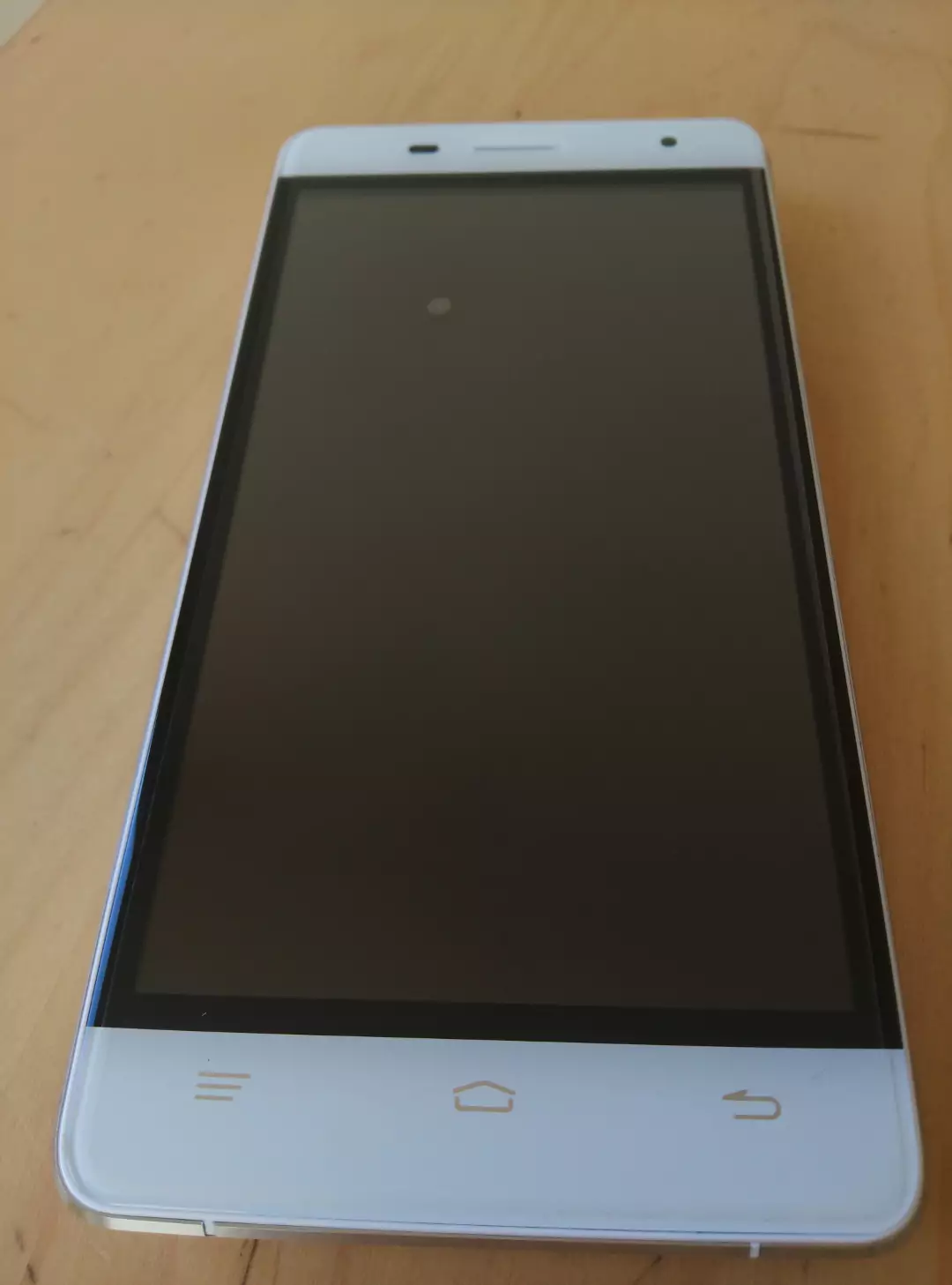 Sur l’avant de l’appareil, aucun logo. Juste l’écran, l’APN frontal et les capteurs. Quand l’appareil n’est pas utilisé, les 3 touches de navigation (réglages, accueil, retour) sont toujours visibles, même si elles ne sont pas rétro-éclairées.