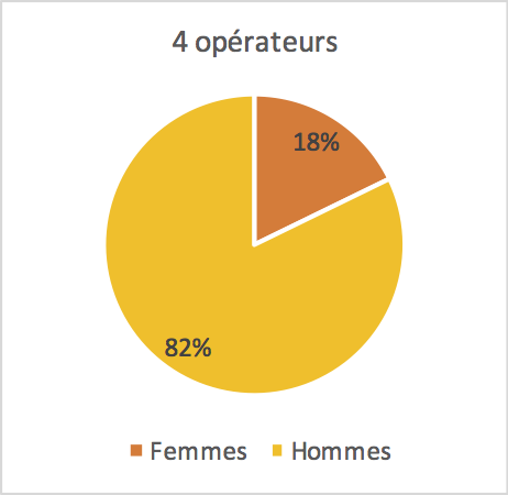 Au total, au sein des équipes dirigeantes des quatre opérateurs confondus, la proportion de femmes est de 18 %, soit 4 % de plus que la proportion moyenne nationale de femme parmi les dirigeants d’entreprises (14 % sur le territoire français).