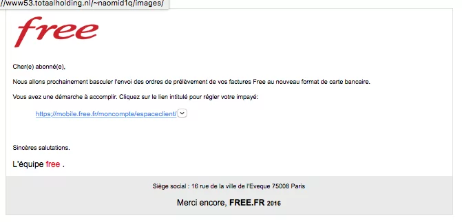 Ce type d’attaques s’est multiplié au fil du temps et les techniques sont nombreuses pour tromper la vigilance des abonnés. Nous vous conseillons de ne pas cliquer sur le lien et de ne pas répondre à ce courriel. Si vous avez déjà mordu à l’hameçon, veuillez immédiatement modifier votre mot de passe Free Mobile, et contacter votre établissement bancaire (afin de faire opposition sur votre CB).