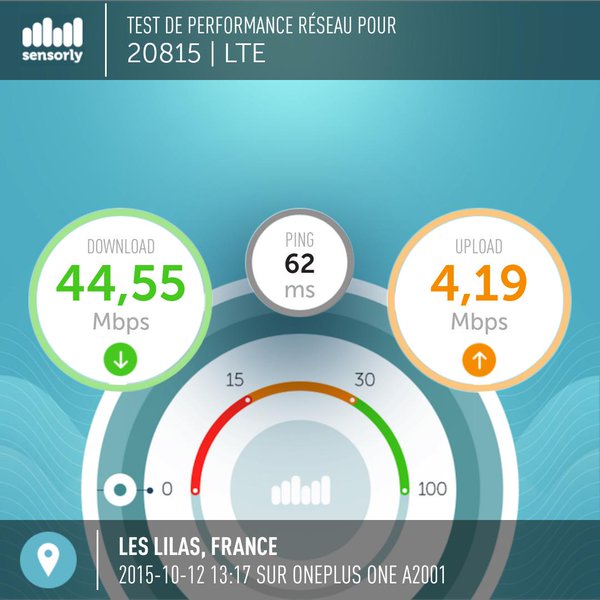 Ci-dessous, un exemple de test de débit réalisé avec un iPhone 5s (terminal 4G de catégorie 4, soit un débit théorique maximum de 150 Mb/s en réception et 50 Mb/s en émission). Les débits sont très correctes près de la Porte des Lilas avec 44.5 Mb/s en réception et 4.1 Mb/s en émission.
