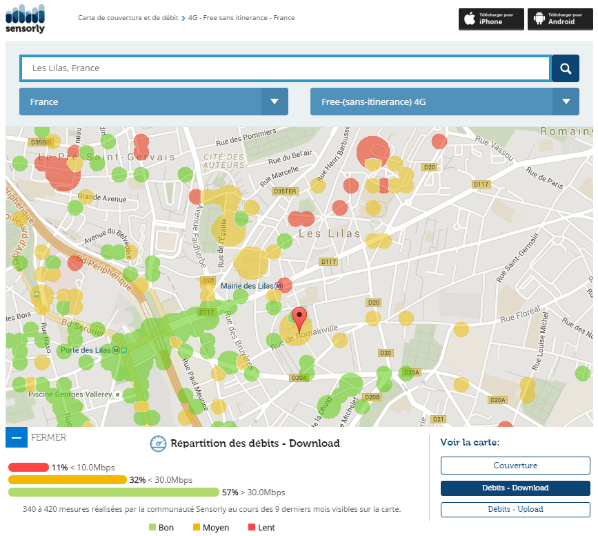Avec les données de notre partenaire Sensorly, Univers Freebox vous propose un focus sur Les Lilas, et vous fait découvrir la carte de la couverture du réseau 4G et des débits.