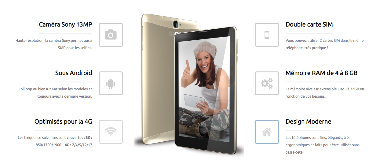 Du plus simple jusqu’au format phablette (de 7 pouces), les smartphones Sky Devices sont très variés. Sous Android, ils offrent la possibilité d’intégrer 2 cartes SIM, disposent d’une caméra Sony de très haute résolution (pouvant aller jusqu’à 13 MP) et d’un emplacement pour carte mémoire jusqu’à 32 Go.