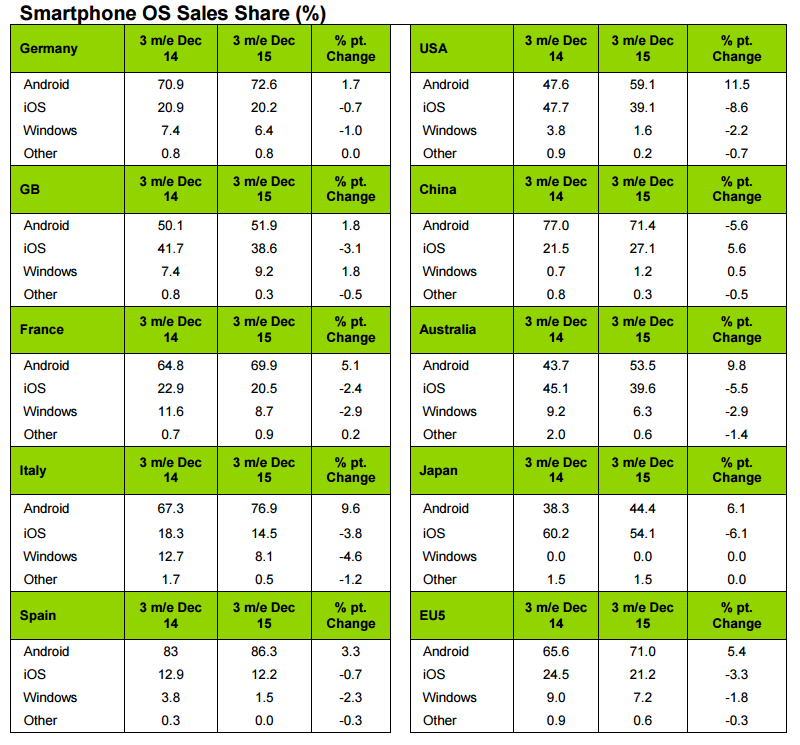 À la vue des chiffres dans le graphique ci-dessus, on constate que le système d’exploitation d’Apple, IOS, recule partout dans le monde sauf en Chine avec une progression entre décembre 2014 et décembre 2015 de 5,6 % en terme de parts de marché. La France voit, de son côté, et à l’instar des principaux pays d’Europe, une montée en puissance de l’OS de Google, Android, qui progresse de 5,1 points dans l’hexagone. On constate également la baisse en régime, sauf en Grande-Bretagne et en Chine, des Windows Phone qui n’ont pas réussi à se lancer sur le marché des smartphones l’année dernière, faute notamment aux derniers modèles de Nokia Lumia assez critiqué et d’une sortie assez tardive de Windows 10 mobile.