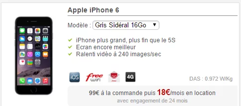 L’iPhone 6 16Go passe de 679€ à 639€ soit une baisse de 40€. Ce smartphone est également proposé en 4 fois sans frais au nouveau tarif de 162€ à la commande puis 159€ durant 3 mois. Il est également proposé à la location.