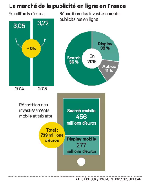 Le marché de la publicité en ligne a atteint 3,2 milliards d’euros en 2015, un montant qui équivaut à 27,7 % du marché. À titre de comparaison, la télévision représente 28,3 % du marché et 21,2% pour la presse écrite. La croissance du secteur est notamment liée à une augmentation croissante des activités « display » (bannières, vidéos…) mais aussi à la bonne activité du « search » (les liens sponsorisés) qui se portent bien grâce aux bons chiffres des ventes de smartphones. En revanche, les investissements publicitaires sur le mobile, d’un montant de 733 millions et en augmentation de 59 % en 2015, restent toujours en deçà de celle des autres pratiques, de plus que 52 % des connexions internet passent par le mobile :