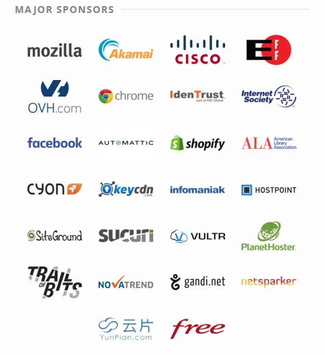 D’autres grands noms font confiance au projet Let’s Encrypt. On retrouve ainsi Facebook, Cisco, Akamai, Mozilla, Google (Chrome), etc…
