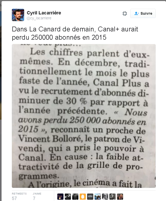 Selon le Canard Enchaîné sorti ce mercredi, Canal+ aurait perdu 250 000 abonnés sur l’année 2015. Sur le seul mois de décembre, mois au cours duquel Canal+ réalise sa plus grande part des recrutements, ceux-ci auraient été en baisse de 30%.