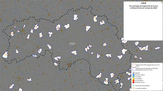 D’après la carte des déploiements engagés, plusieurs déploiements sont engagés pour les prochains 12-18 mois et sont éparpillé dans l’Orne. Tous concernent une montée en débit DSL.