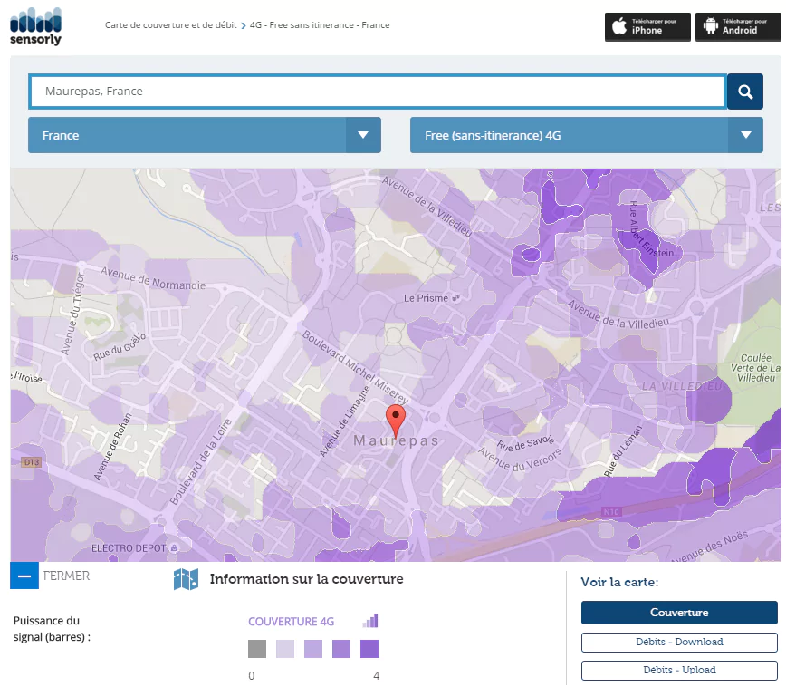 Avec les données de notre partenaire Sensorly, Univers Freebox vous propose un focus sur Maurepas et vous fait découvrir la carte de couverture et des débits du réseau mobile de Free.