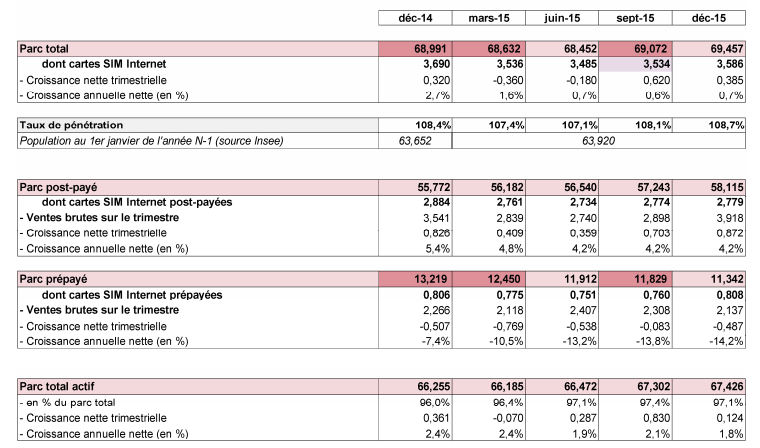 Le nombre de cartes SIM souscrites auprès des opérateurs de réseau en métropole progresse de 480 000 en un trimestre (62,1 millions au 31 décembre 2015), tandis que le nombre de cartes souscrites auprès des opérateurs virtuels (MVNO) recule de 95 000 et s’établit à 7,4 millions.