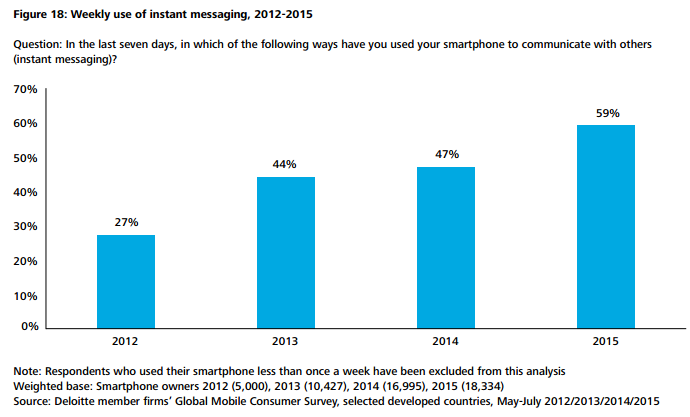 L’enquête met également en avant une donnée intéressante : les utilisateurs de smartphones s’appellent de moins en moins au profit des SMS ou des messageries instantanées, qui connaissent un succès grandissant depuis quatre ans, comme le montre le graphique ci-dessous : « 26 % des détenteurs de smartphone ne passeront aucun appel en voix au cours d’une semaine donnée » affirme le cabinet d’audit.
