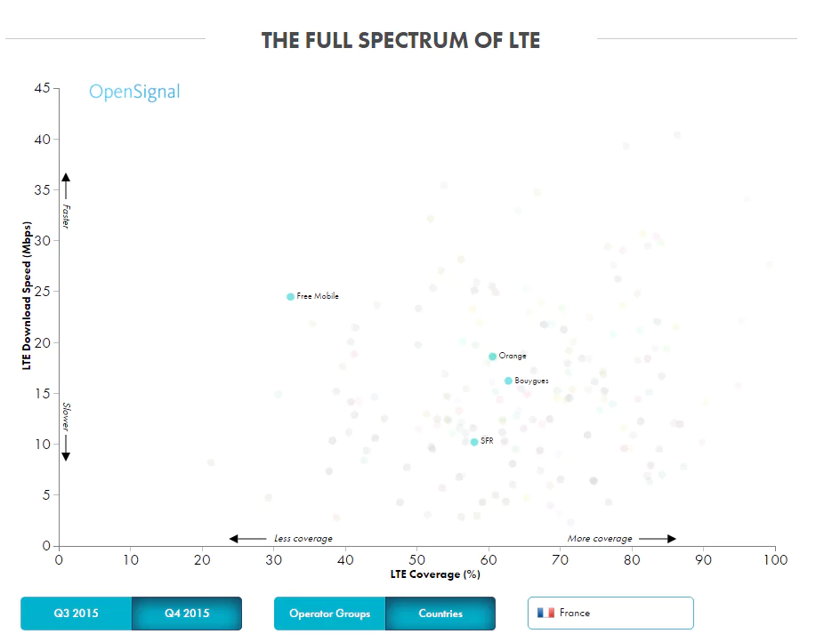 La France cherche encore sa place au classement des pays avec les meilleurs temps de connexion en 4G et cela pourrait être la faute de Free. En effet, d’après les données émanant du site OpenSignal sur le spectre de la 4G (LTE en terminologie anglosaxonne), Free se positionne en bon dernier dans l’hexagone concernant le temps de connexion en 4G avec un taux de seulement 32 % alors que la moyenne nationale (regroupant l’ensemble des opérateurs) est de 51 %. Free est donc en partie responsable du mauvais classement de la France par rapport aux pays les plus performants en terme de temps de connexion 4G. SFR est troisième avec une durée de connexion en 4G de 58 %, Orange deuxième avec 61 % juste derrière Bouygues Télécom qui possède le meilleur taux de connexion en 4G avec 63 %. Precisons cependant que concernant SFR, il utilise en partie le reseau 4G de Bouygues Telecom, ce qui augmente par conséquant son taux de connexion.