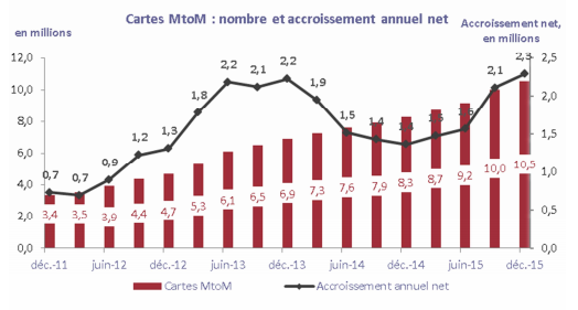 Le nombre de cartes SIM pour objets communicants (cartes « MtoM ») enregistre sa plus forte croissance annuelle avec 2,3 millions de cartes supplémentaires selon l’observatoire des services mobiles de l’ARCEP. Le nombre de cartes MtoM s’élève à 10,5 millions au 31 décembre 2015, en croissance de 515 000 sur le trimestre, après un pic de +860 000 cartes au troisième trimestre 2015.