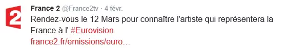 Encore un peu de patience ! France 2 a indiqué sur son compte Twitter annoncer l’artiste et la chanson de l’Eurovision 2016 le 12 mars prochain. L’heureux élu se verra endosser la succession de Lisa Angell qui avait terminé 25ème sur 27 avec son titre "N’oubliez pas".