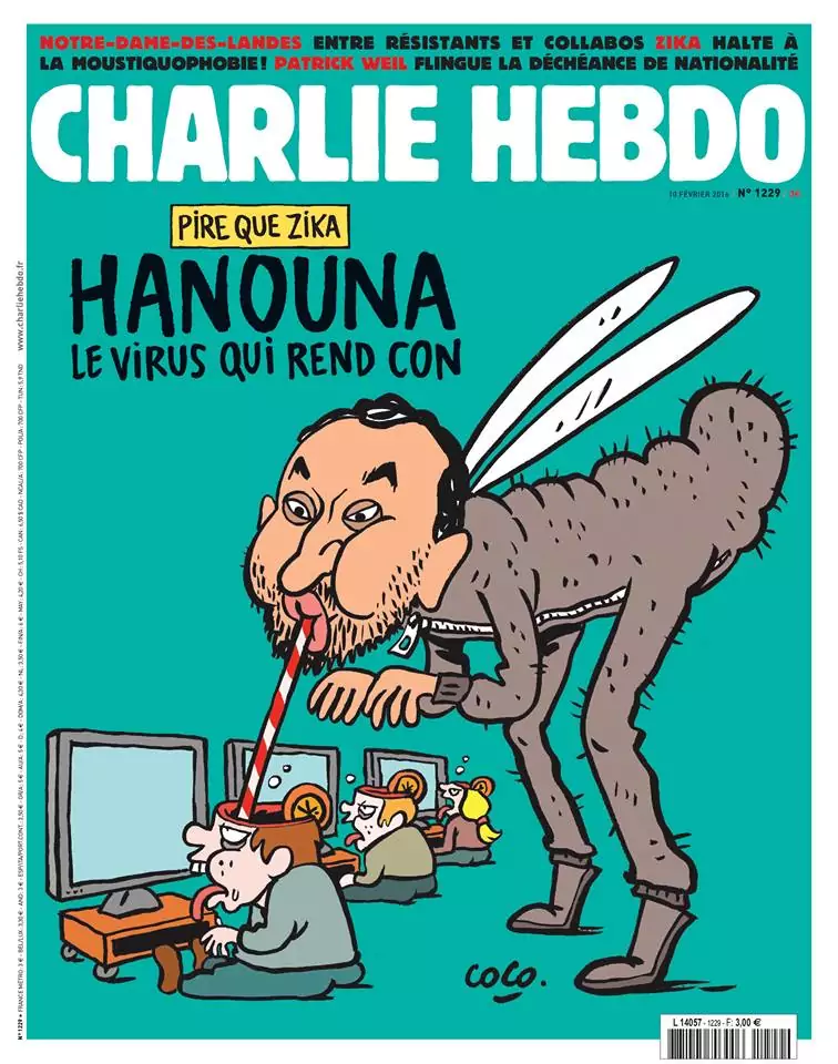 On peut y voir le présentateur déguisé en moustique en train de boire à la paille le cerveau des téléspectateurs, avec comme légende "Pire que Zika, Hanouna, le virus qui rend con". Nul doute que TPMP reviendra sans doute sur cette une dans les jours qui arrivent !