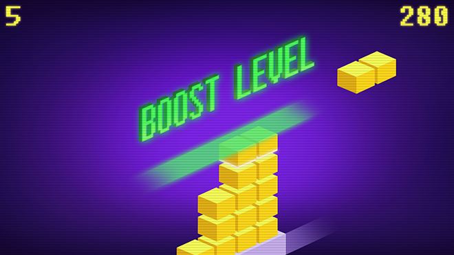 Des groupes de quatre blocs se déplacent de droite à gauche, il faudra, en appuyant au bon moment, les stopper au centre de l’écran. Si au moins un bloc dépasse d’un côté ou de l’autre il sera supprimé et vous aurez donc un bloc de moins pour l’empiler sur les autres. Une fois arrivé à zéro la partie se termine.