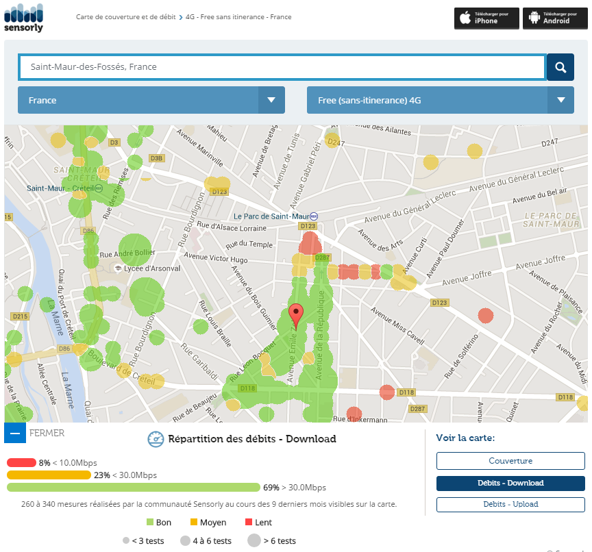 Avec les données de notre partenaire Sensorly, Univers Freebox vous propose un focus sur St-Maur-des-fossés et vous fait découvrir la carte de la couverture du réseau 4G et des débits.