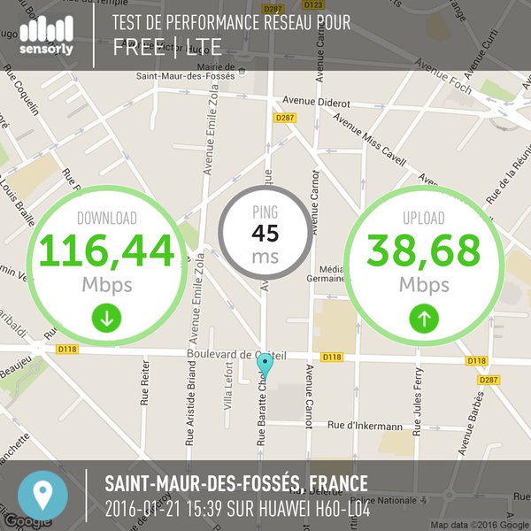 Ci-dessous, un test de débit réalisé avec un Honor 6 (terminal 4G de catégorie 6, soit un débit théorique maximum de 300 Mb/s en réception et 50 Mb/s en émission) à St-Maur-des-fossés.. Les débits sont excellents avec 116.4 Mb/s en réception et 38.6 Mb/s en émission.