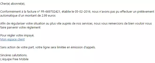 Pour votre sécurité et pour éviter tous soucis, ne cliquez pas directement sur les liens présents dans les mails. Il est préférable de vous rendre directement sur le site de Free en tapant les adresses suivantes : https://subscribe.free.fr/login/ pour votre espace Freebox ou https://mobile.free.fr/moncompte/ pour votre espace Mobile.