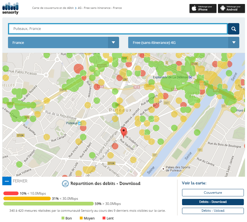 Couverture et débit 4G du réseau mobile de Free : Focus sur Puteaux