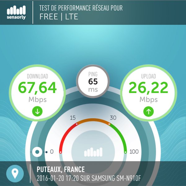 Ci-dessous, un test de débit réalisé avec un Samsung Galaxy Note 4 à Puteaux. Les débits sont très bons avec 67.6 Mb/s en réception et 26.2 Mb/s en émission.