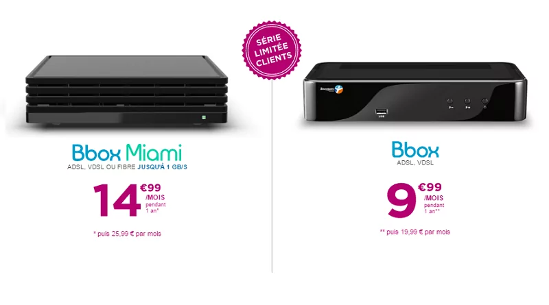Ainsi l’offre Bbox Miami est proposée à 14,99€ par mois durant 1 an, au lieu de 25,99€. En zone dégroupée étendue, il faut ajouter 8€/mois.
