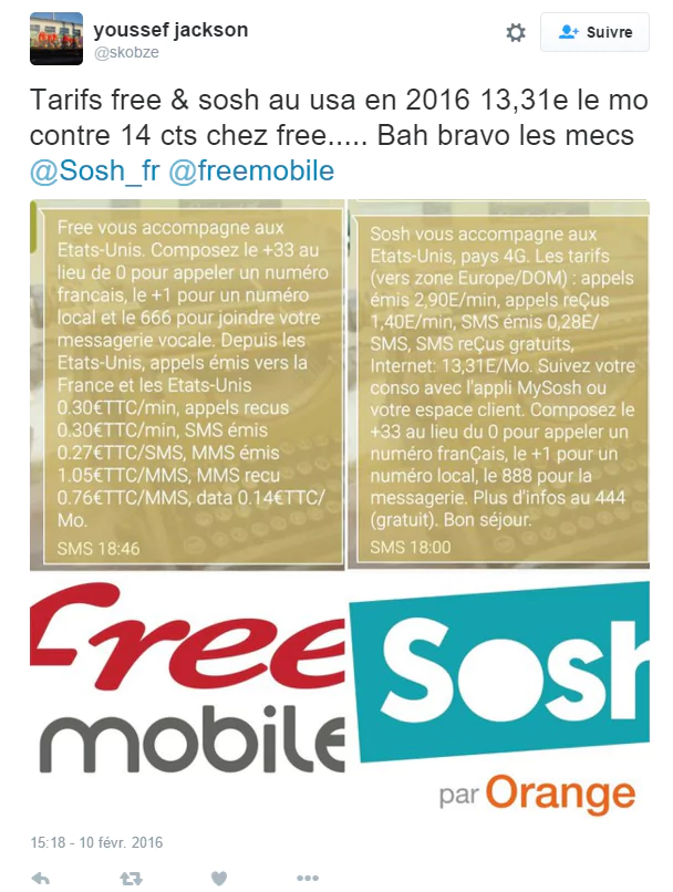 Mais même avec le forfait 2€ de Free les tarifs des communications aux Etats-Unis sont sans aucune mesure avec ceux affichés par Sosh, l’opérateur low cost d’Orange. C’est ce d’ont a pu se rendre compte Youssef Jackson, sur Twitter, au travers du message de bienvenue envoyé par Sosh d’un part et Free d’autre part. Et les chiffres parlent d’eux-mêmes :