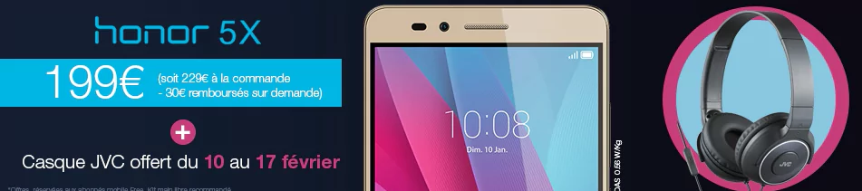 Univers Freebox vous l’annonçait la semaine dernière, c’est désormais effectif, le Honor 5X est arrivé dans la boutique Free Mobile. Il est proposé au tarif de 229 euros en paiement comptant, mais il bénéfice d’une offre de réduction de 30€ ce qui porte son prix final à 199€. Par ailleurs, un casque JVC est offert du 10 au 17 février
