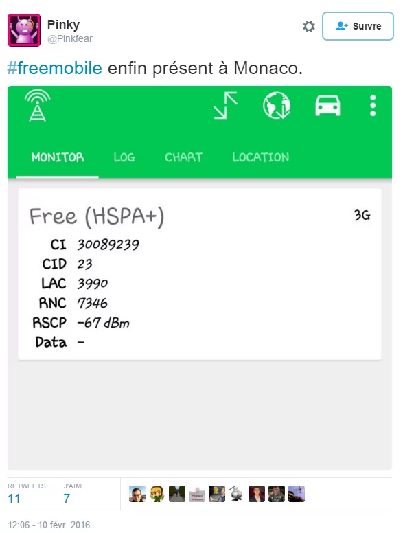 Le réseau Free va-t-il enfin s’installer définitivement sur le rocher ? Jusqu’ici, les abonnés Free Mobile ne captaient pas le réseau Free à Monaco, mais cela est en train de changer. En effet, un abonné Free Mobile sur place (@Pinkfear sur Twitter) a repéré, hier, que le réseau Free peut être capté en 3G à certains endroits de la principauté, notamment dans la rue du Gabian.