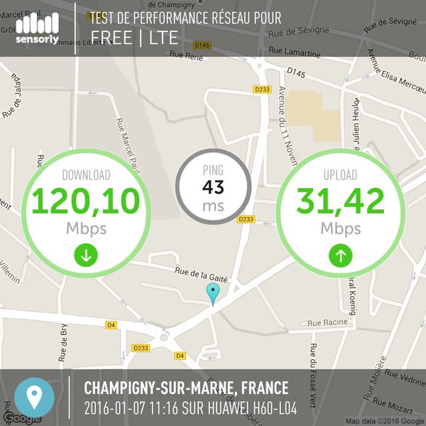 Ci-dessous, un test de débit réalisé avec un Honor 6 (4G cat.6) à Champigny-sur-Marne. Les débits sont excellents avec 120.1 Mb/s en réception et 31.4 Mb/s en émission.