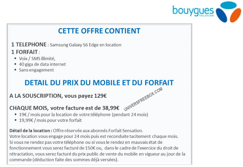 - 17 €/mois pendant 24 mois pour la location du Galaxy S6 Edge (19€ /mois chez Bouygues Télécom).